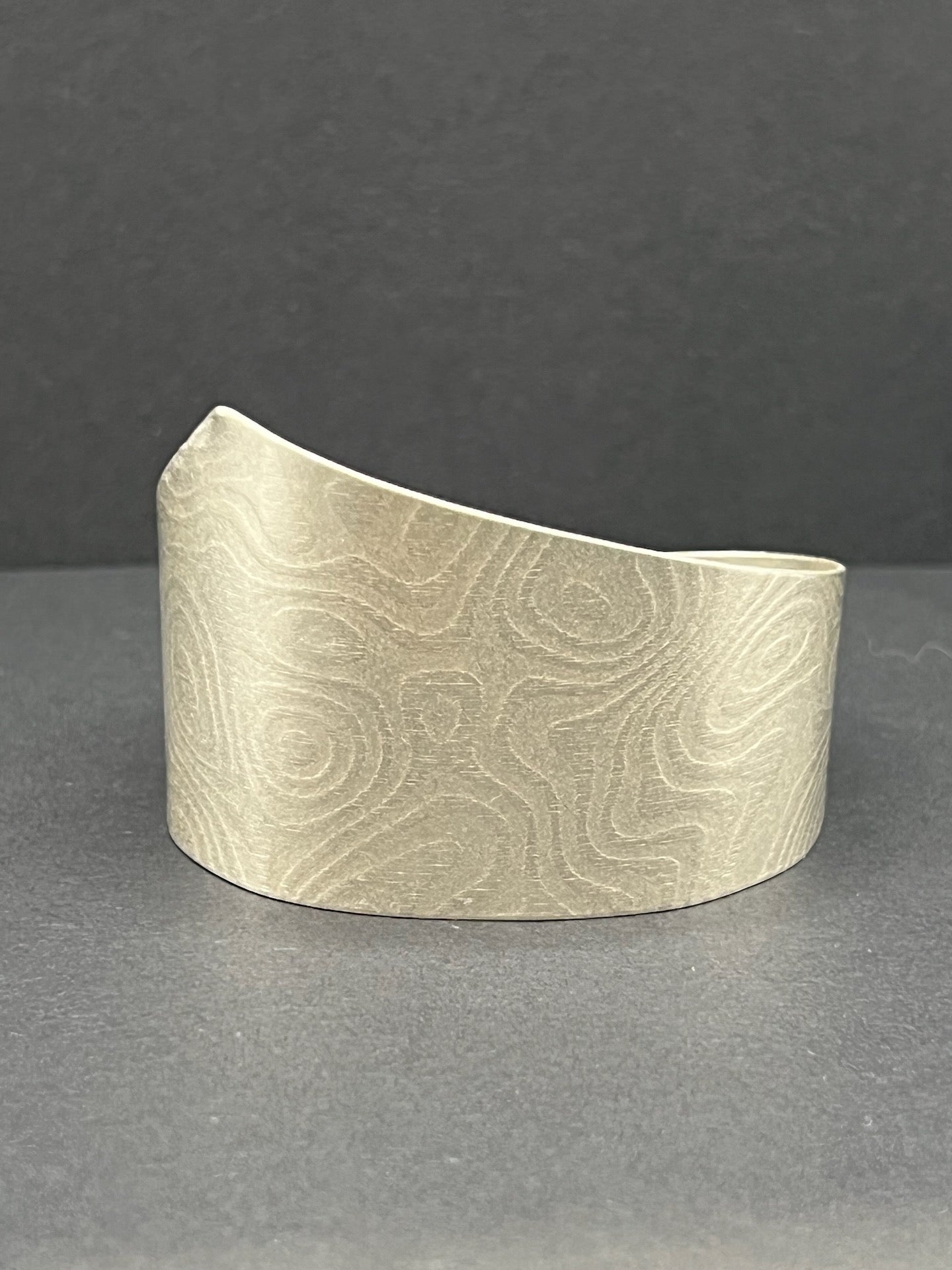 Measuring 1.75" at its peak, and tapering down to .5-.75" at the edges, this chic asymmetrical cuff is a great addition to formal or casual styles. As with any cuff, adjust it to fit only once when you receive it. Repeated bending of any metal can cause stress fractures.