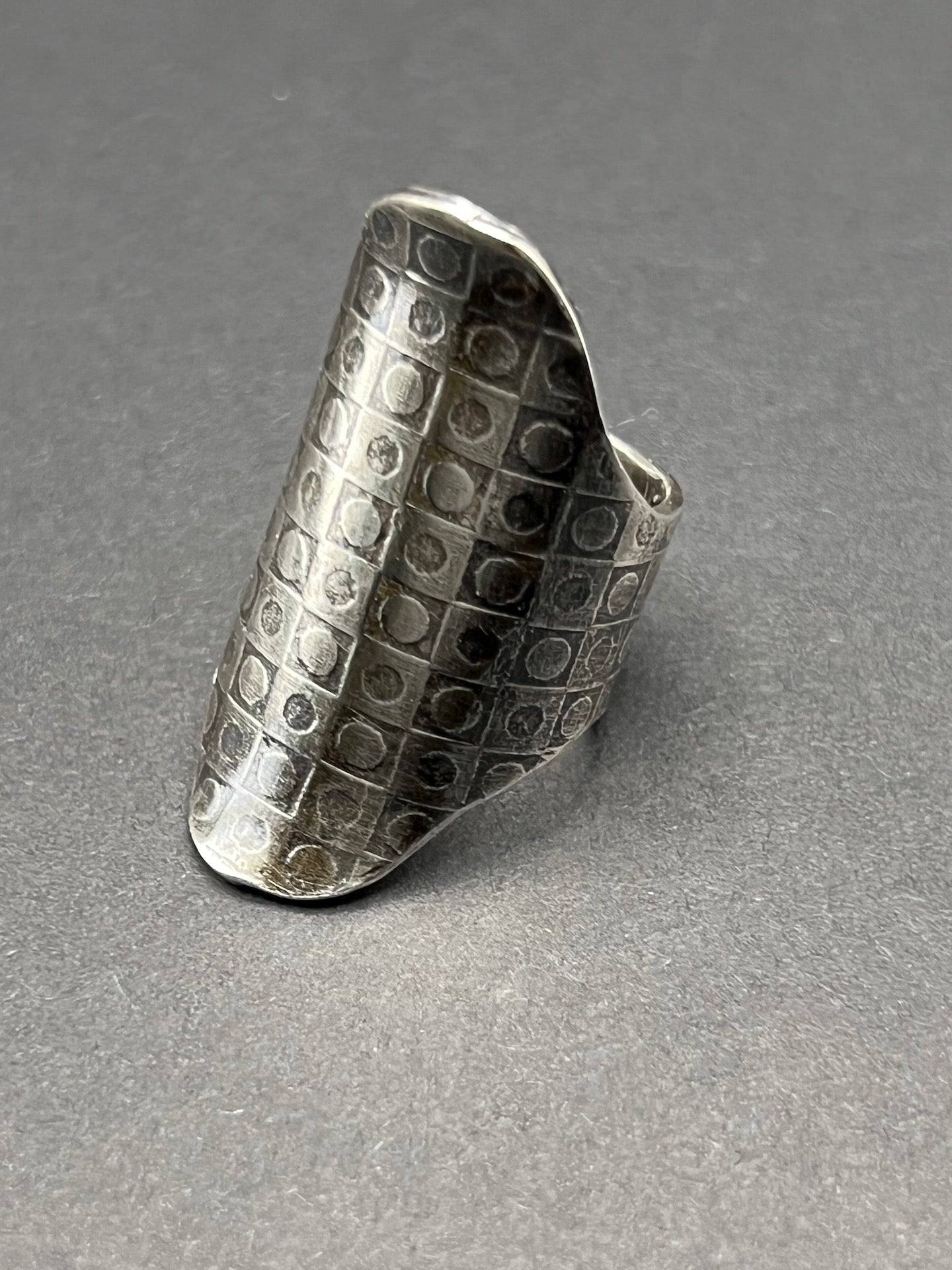 A statement piece for sure! This substantial silver ring is hand forged to have a flared front and back, like a saddle, enabling the large design to still be incredibly comfortable to wear. The shiny finish is complemented with a checkerboard pattern that has been darkened/oxidized for beautiful contrast. As with any ring this wide, consider going up a size or being open to wearing on different fingers.