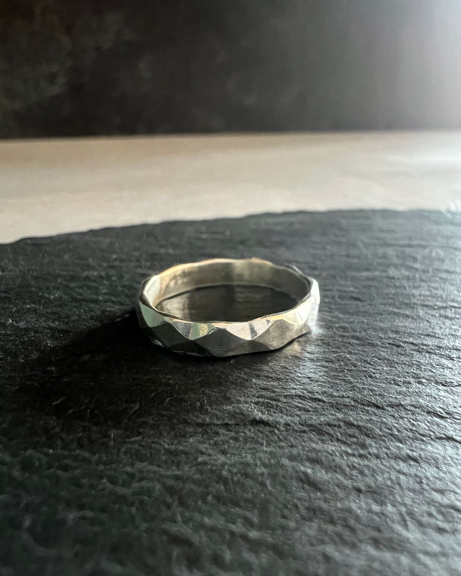 Faceted wide band ring