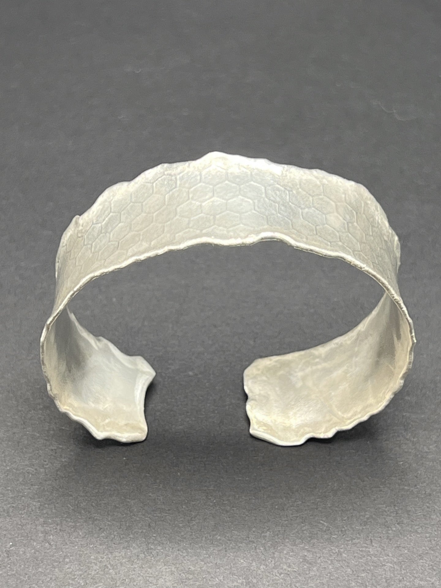Sterling silver has been imprinted with a subtle honeycomb pattern, and gently melted back at the edges for a "torn" look. This cuff is around 1" wide and hand forged. As with any cuff, adjust it to fit only once when you receive it. Repeated bending of any metal can cause stress fractures.