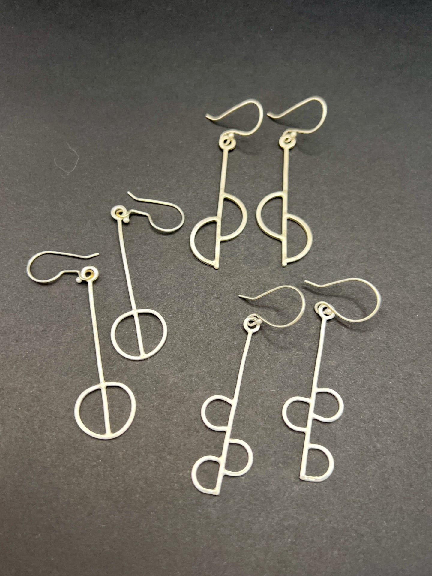 Semi-circles are hand sawn from square sterling silver wire. These lightweight and unique earrings swing roughly ~1.5" from sterling ear wires.
