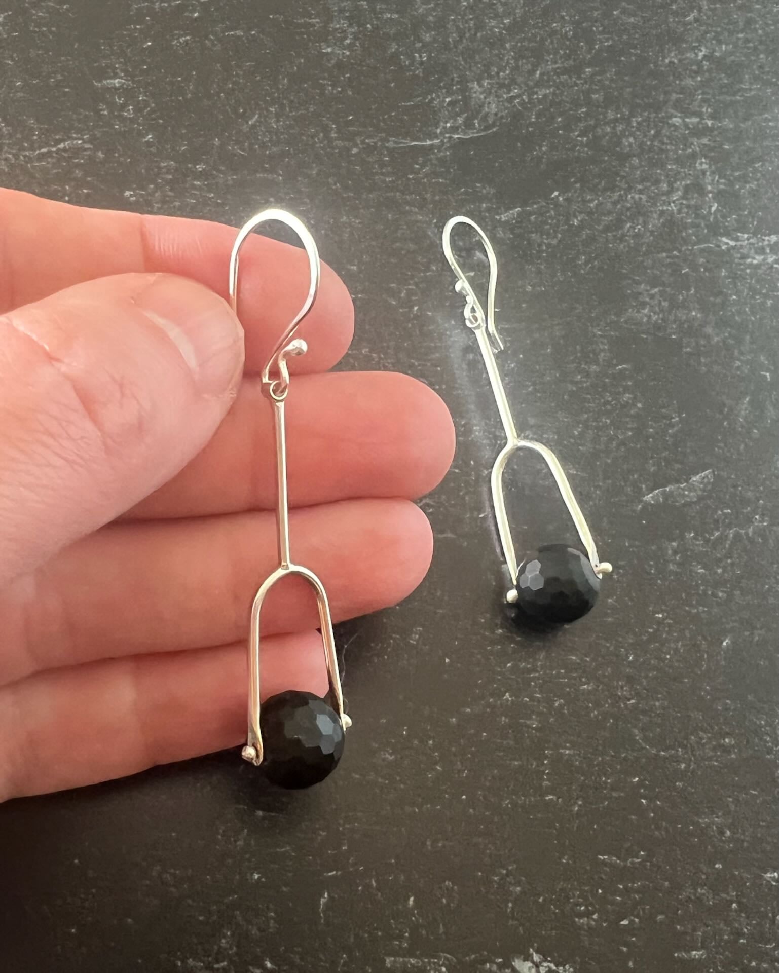 A single onyx bead is pinned into a frame, and hangs ~6cm from the top of the ear wire to the bottom of the bead. These onyx beads are ~1cm in diameter, have a matte finish, and are uniquely faceted (like disco balls).